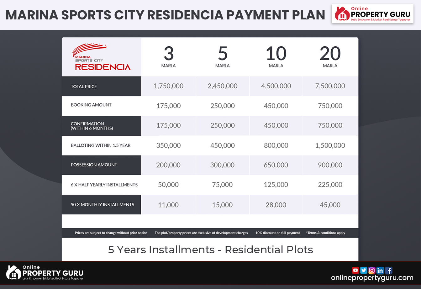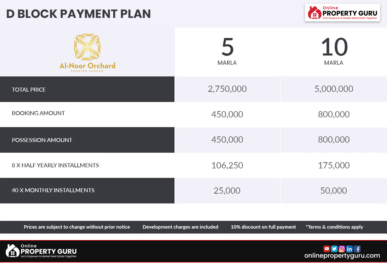 Al Noor Orchard in Marina Sports City provides 3, 5, 10, and 20 Marla plots in a 5-year payment plan with simple installments at a very inexpensive price. The following price data are included in the plan: (Plan is to be attached)