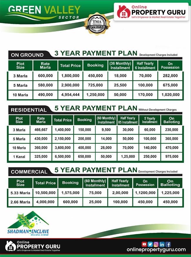 Shadman Enclave Housing Scheme is a place for homes for every type of people from very small to big plots. There are residential plots of 3 Marla, 5 Marla, 7 Marla, 10 Marla, and 1 , while commercial plots include 2.66 Marla and 5.33 Marla. Below is the payment plan for Shadman Enclave Housing Scheme: