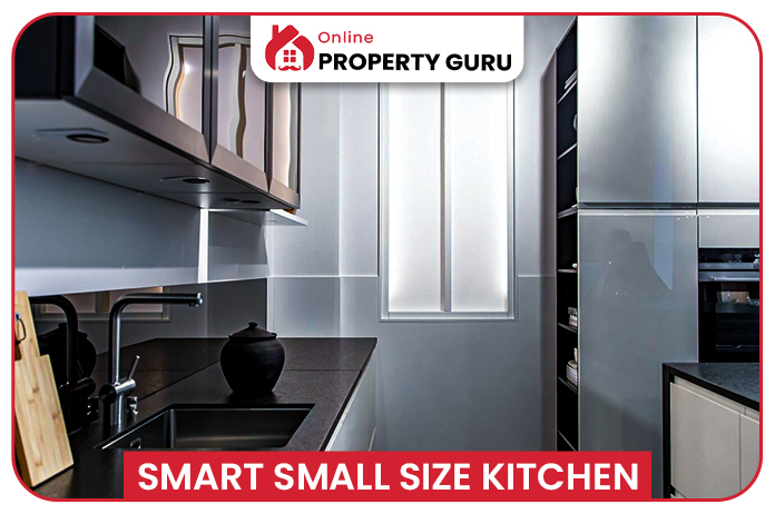 Use light colors, glossy surfaces, mirrors, and under-cabinet lighting. Open shelving and glass-front cabinets can also make the kitchen feel more spacious.